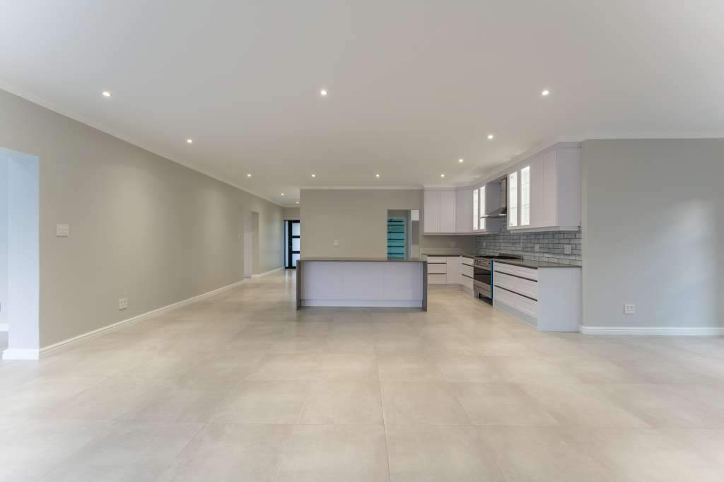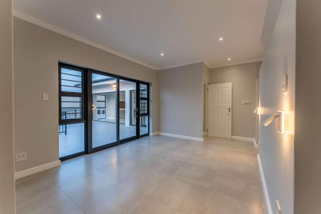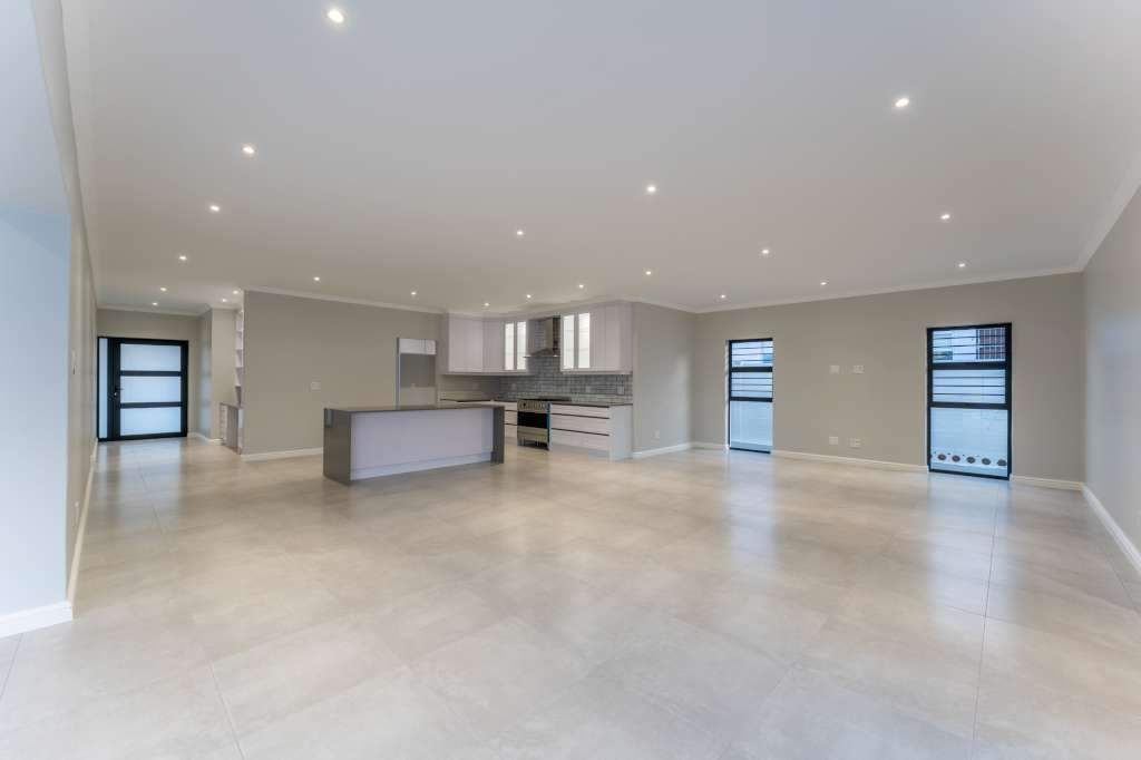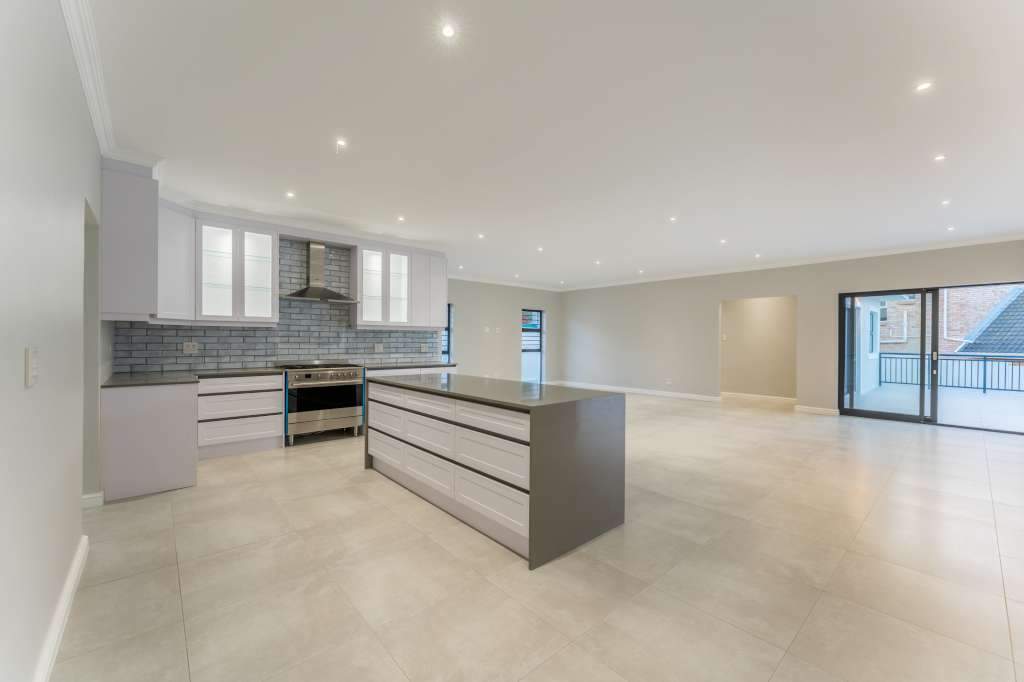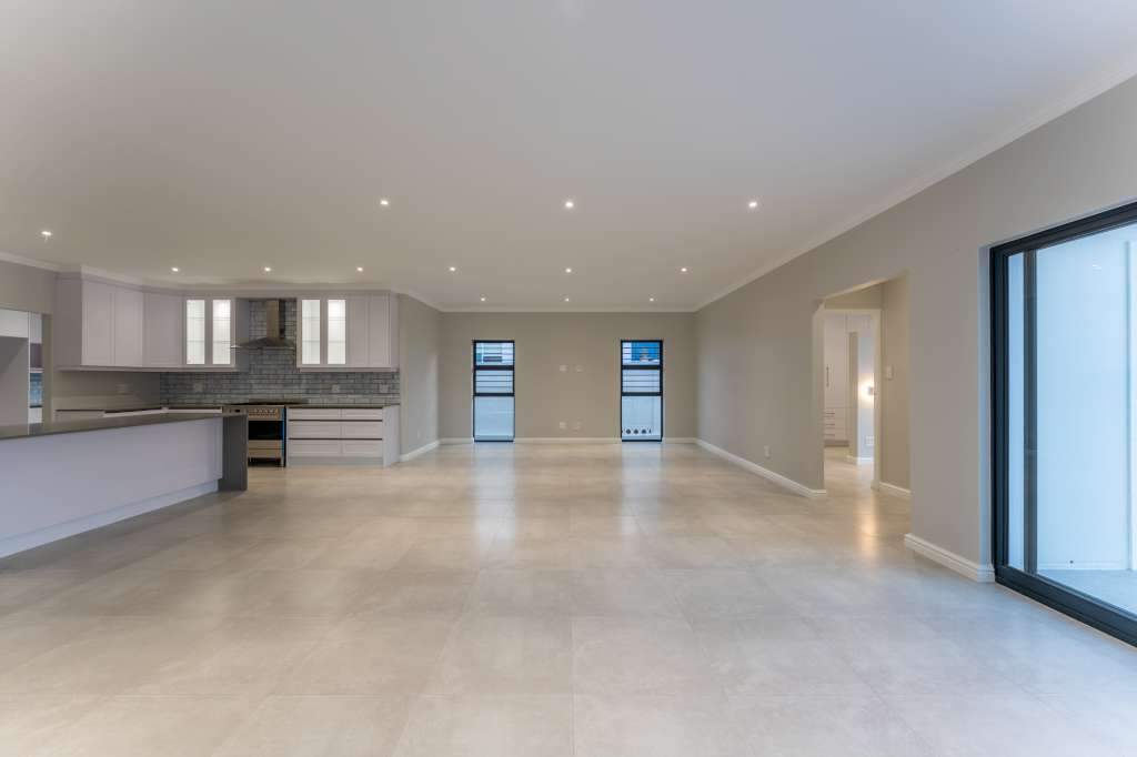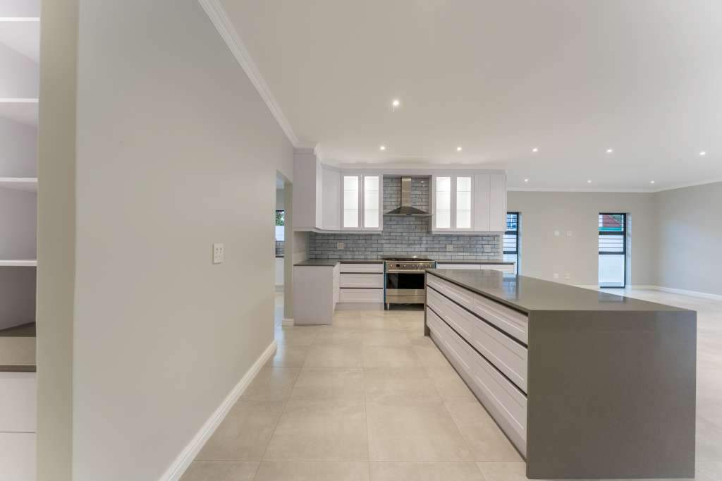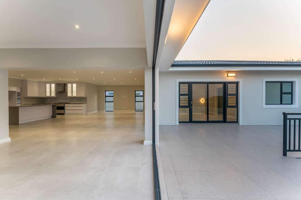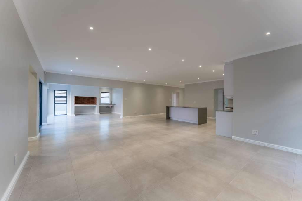 A welcoming entrance through a large glass front door takes one past a library wall and leads into the large open concept living space with an ultra-modern kitchen, overlooking the large lounge/dining area. From there the space connects seamlessly with the braai room where the over-sized wood-fire braai creates a great atmosphere. The lounge and braai room opens up onto an open-air patio, leading to the private back garden.