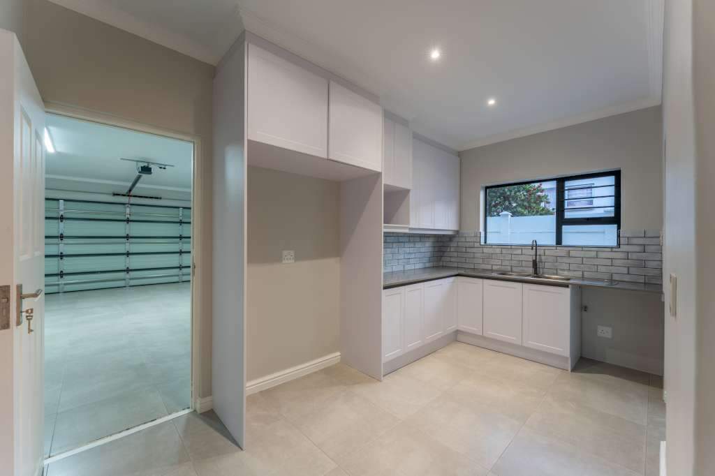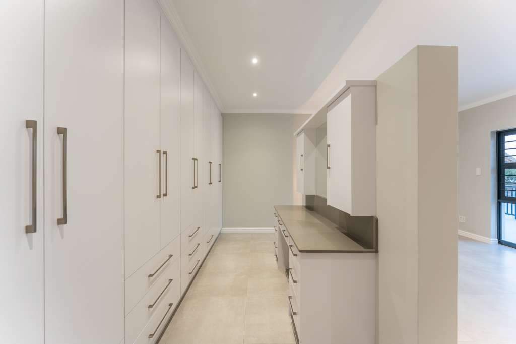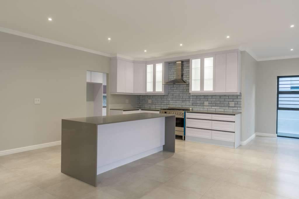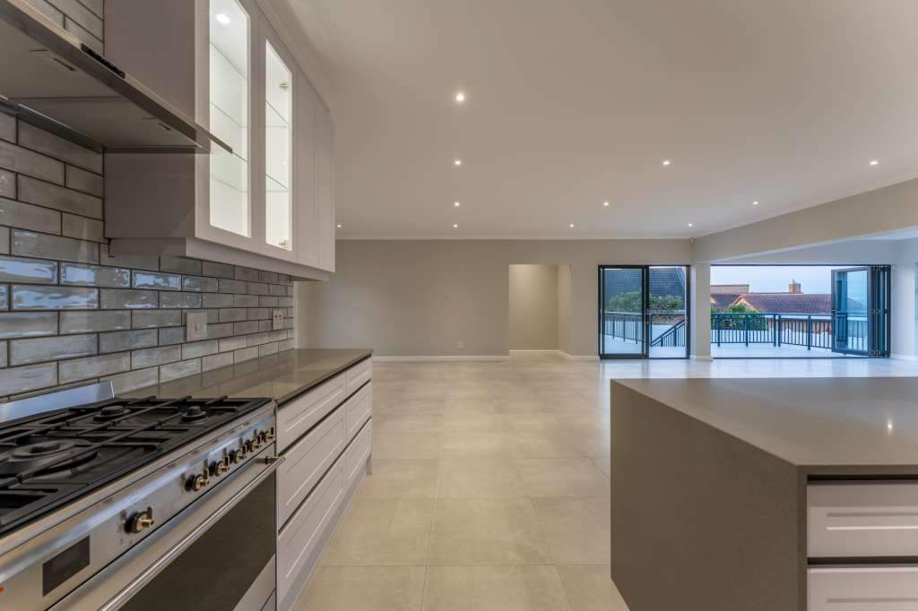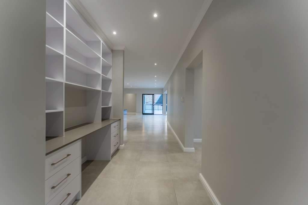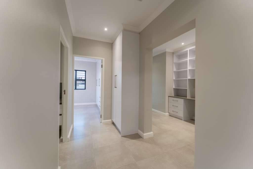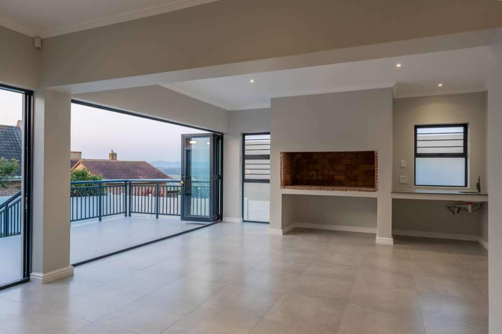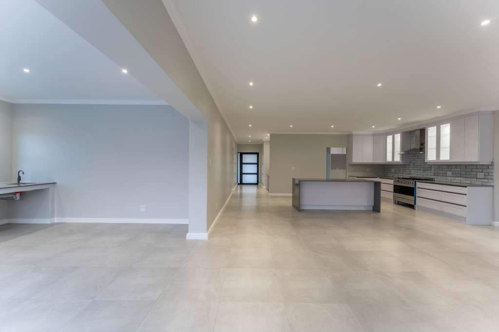 A welcoming entrance through a large glass front door takes one past a library wall and leads into the large open concept living space with an ultra-modern kitchen, overlooking the large lounge/dining area. From there the space connects seamlessly with the braai room where the over-sized wood-fire braai creates a great atmosphere. The lounge and braai room opens up onto an open-air patio, leading to the private back garden.