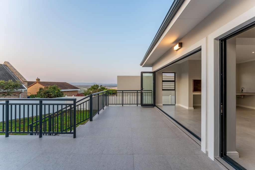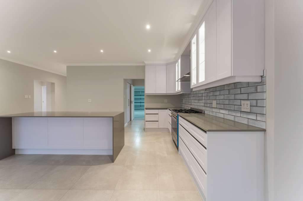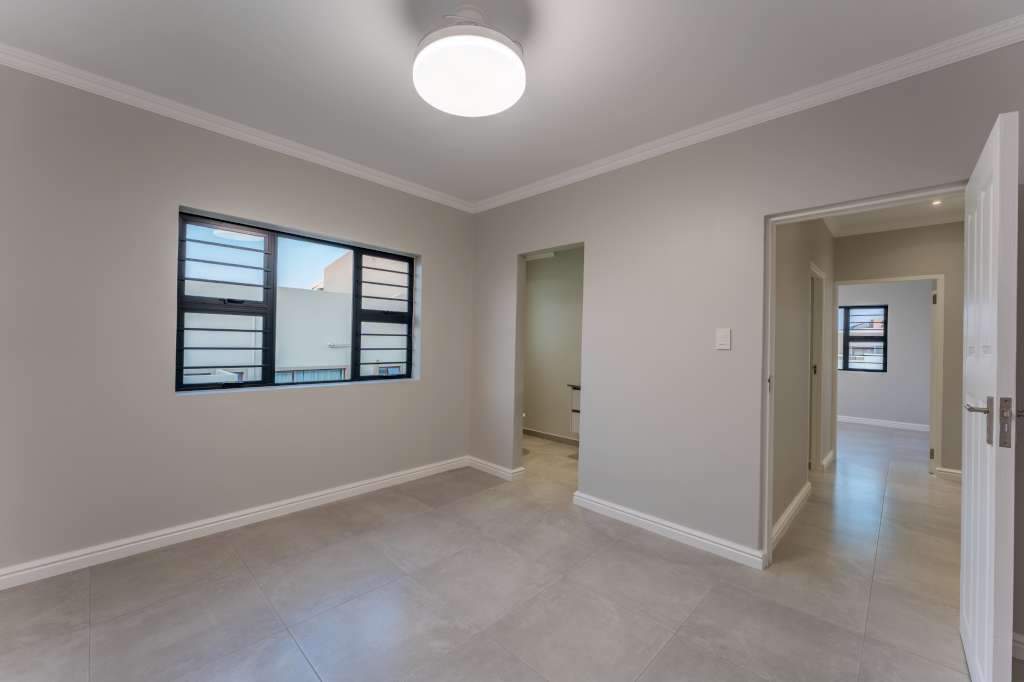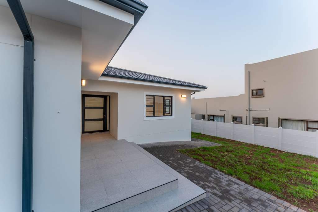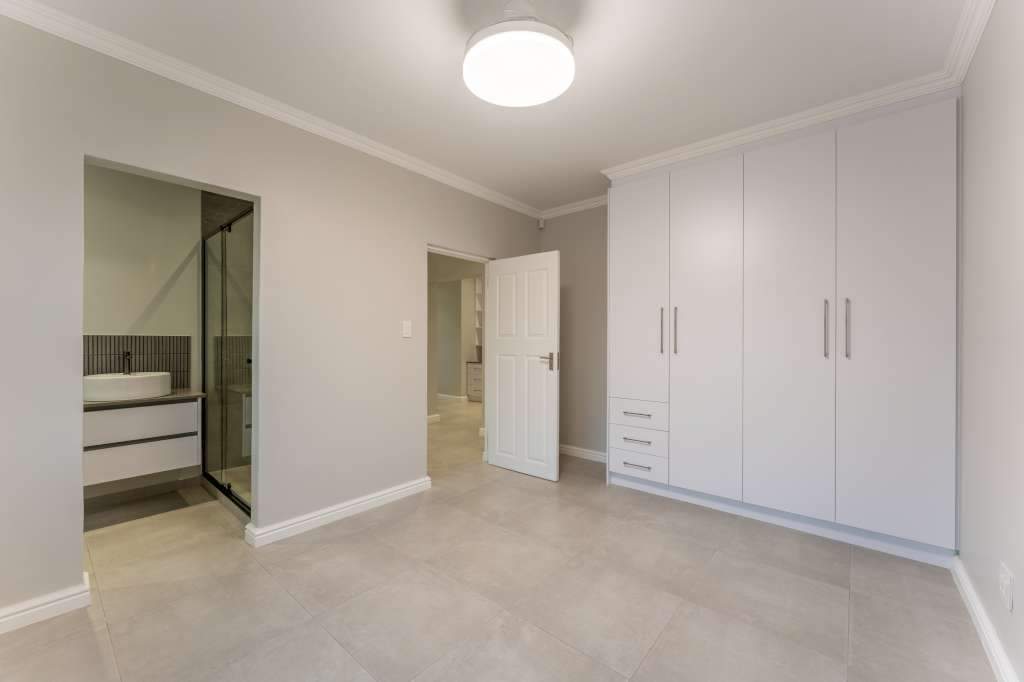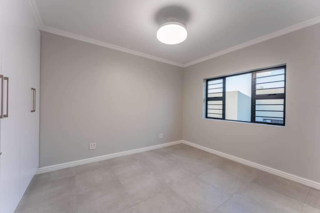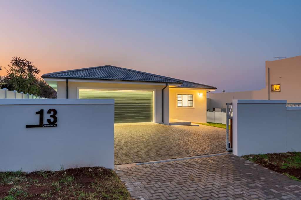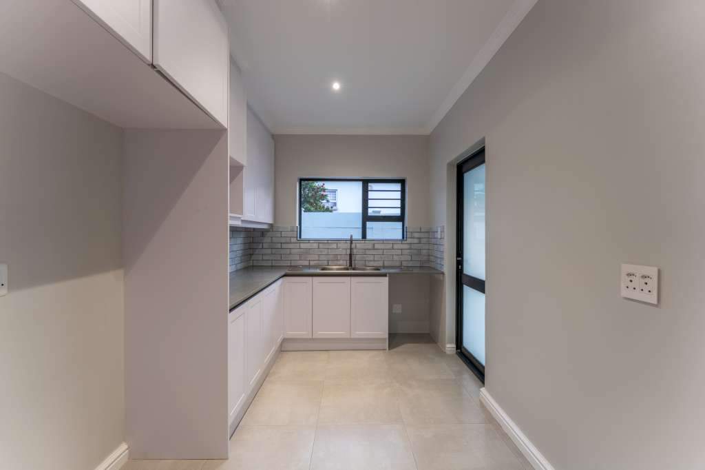 A welcoming entrance through a large glass front door takes one past a library wall and leads into the large open concept living space with an ultra-modern kitchen, overlooking the large lounge/dining area. From there the space connects seamlessly with the braai room where the over-sized wood-fire braai creates a great atmosphere. The lounge and braai room opens up onto an open-air patio, leading to the private back garden.