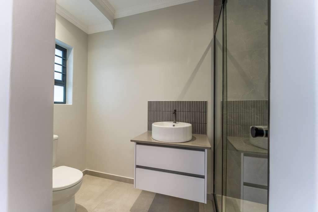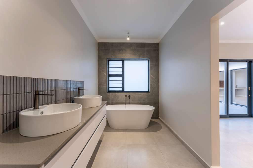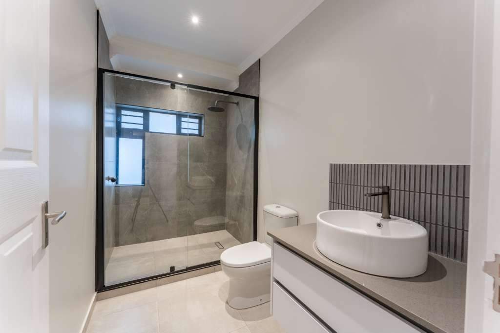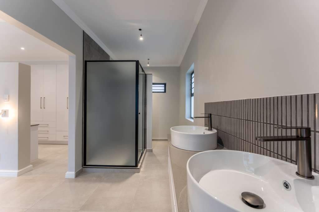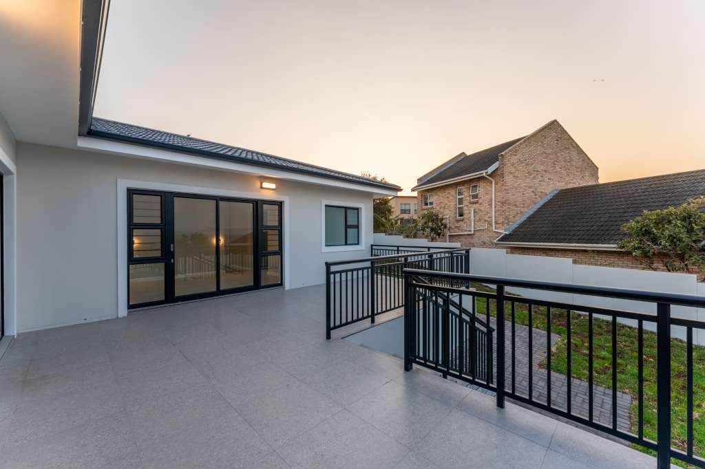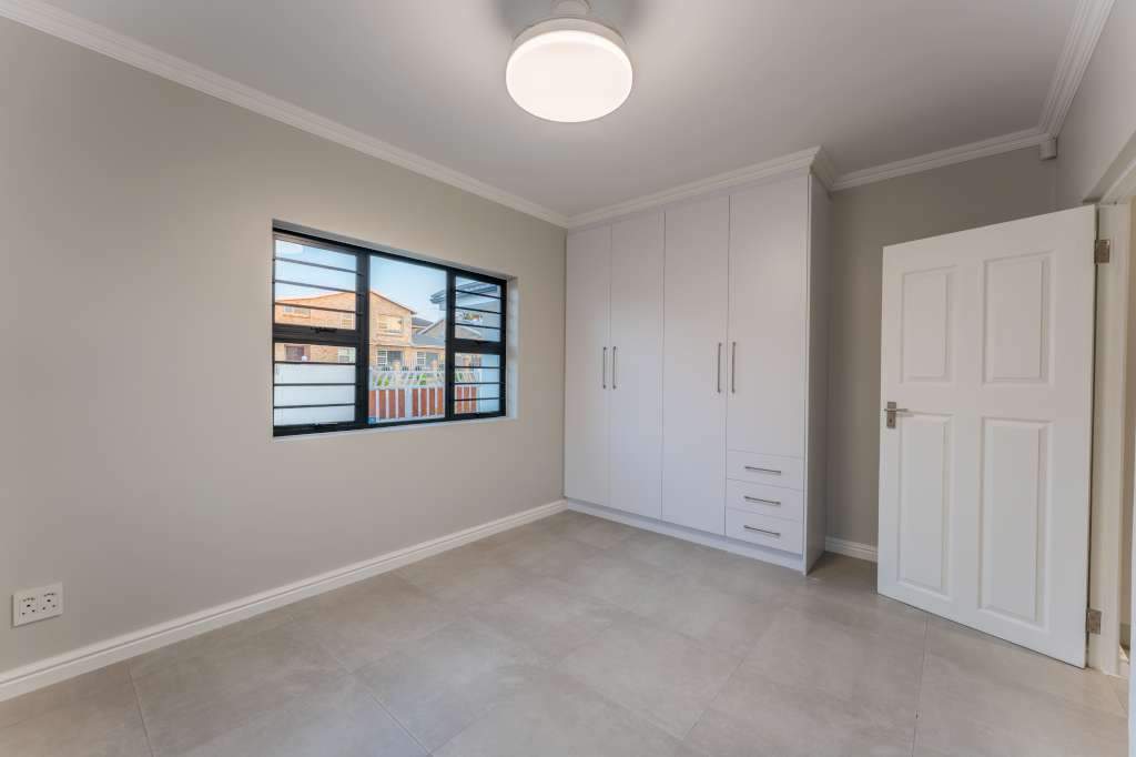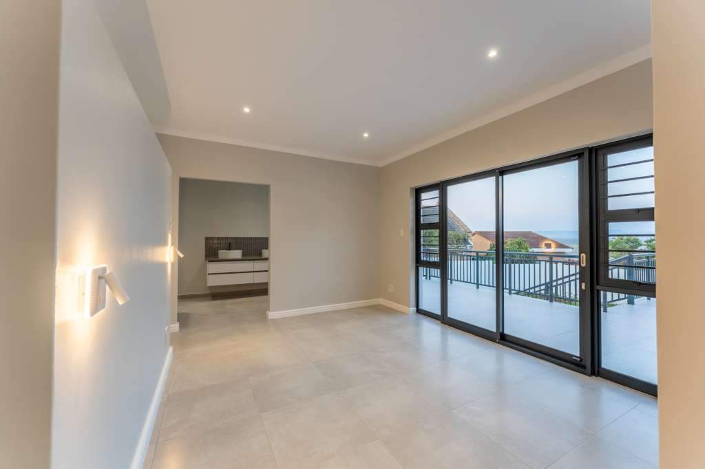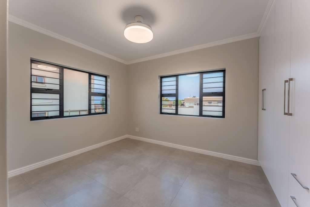 A welcoming entrance through a large glass front door takes one past a library wall and leads into the large open concept living space with an ultra-modern kitchen, overlooking the large lounge/dining area. From there the space connects seamlessly with the braai room where the over-sized wood-fire braai creates a great atmosphere. The lounge and braai room opens up onto an open-air patio, leading to the private back garden.