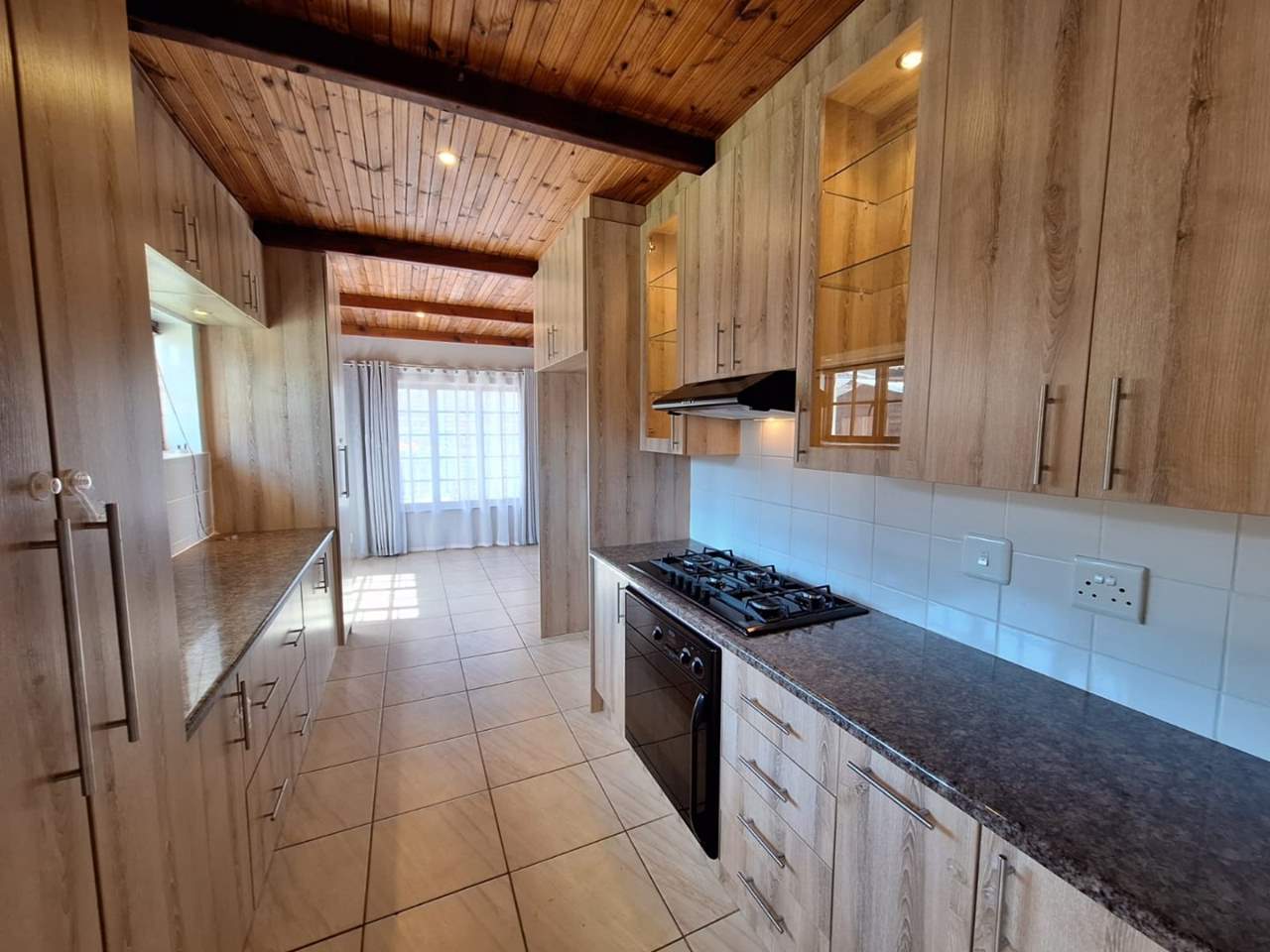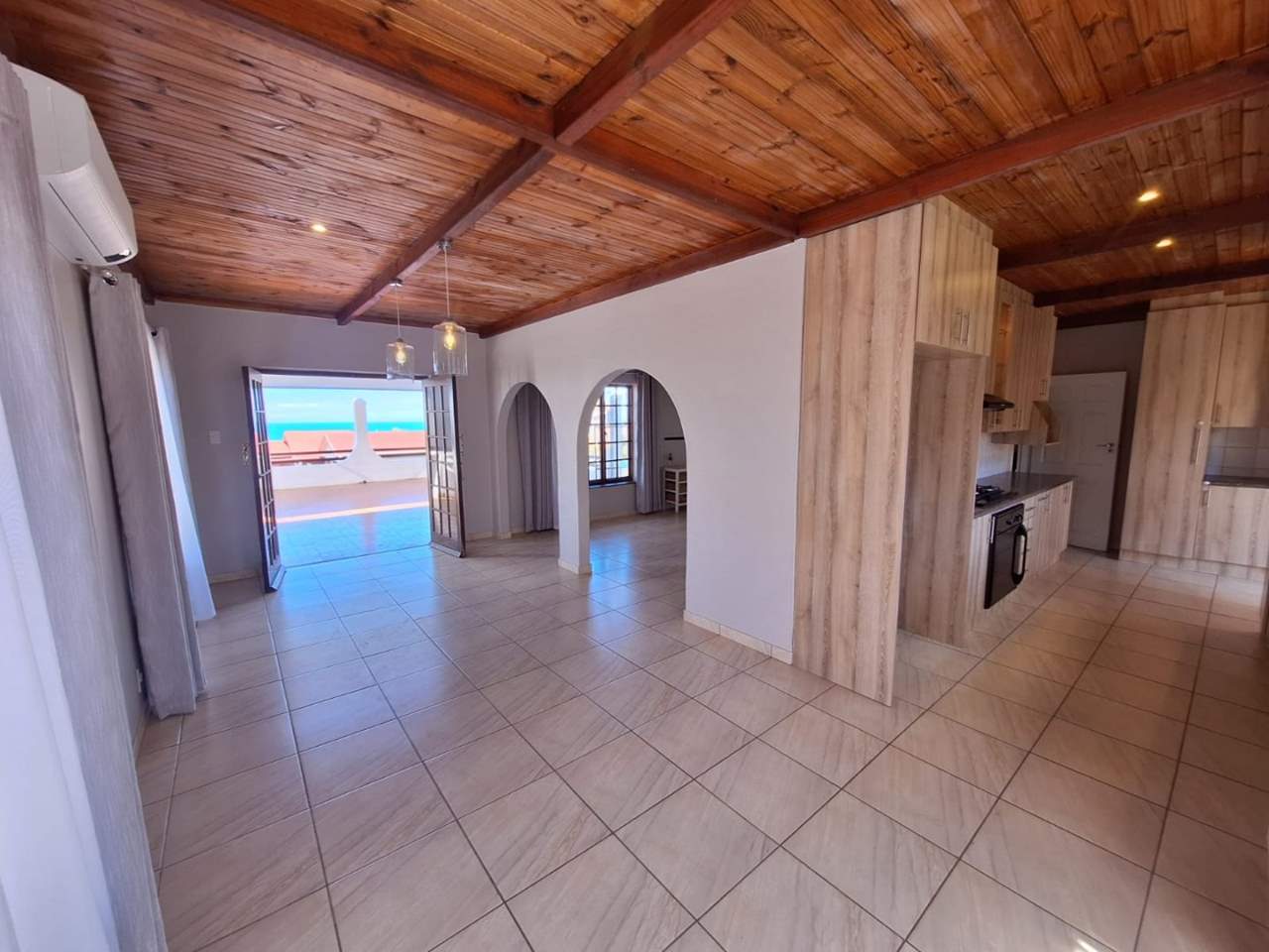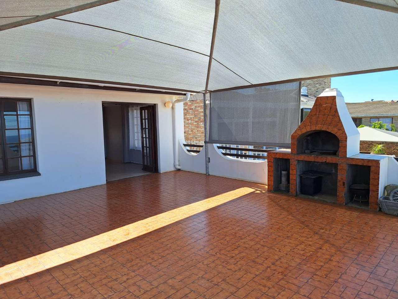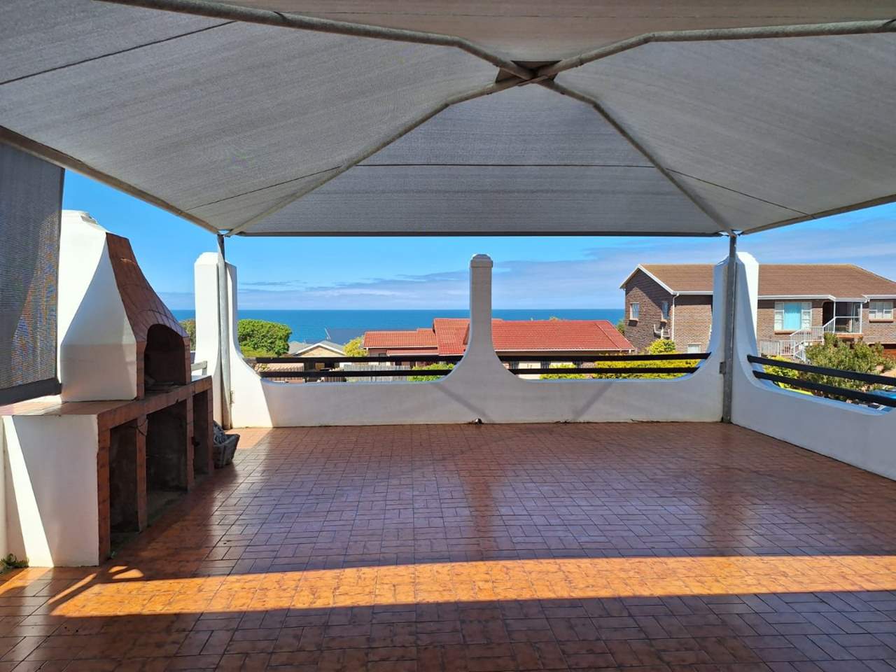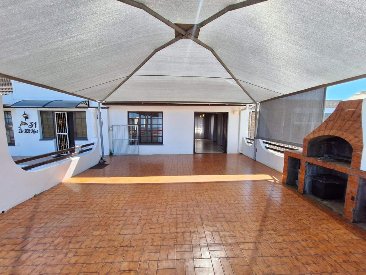 Outdoor living is where this property truly shines. The spacious patio overlooks the ocean and is fitted with a built-in braai and awning, perfect for entertaining or simply enjoying the view. The back garden is enclosed and easy to maintain, with added peace of mind from security beams.