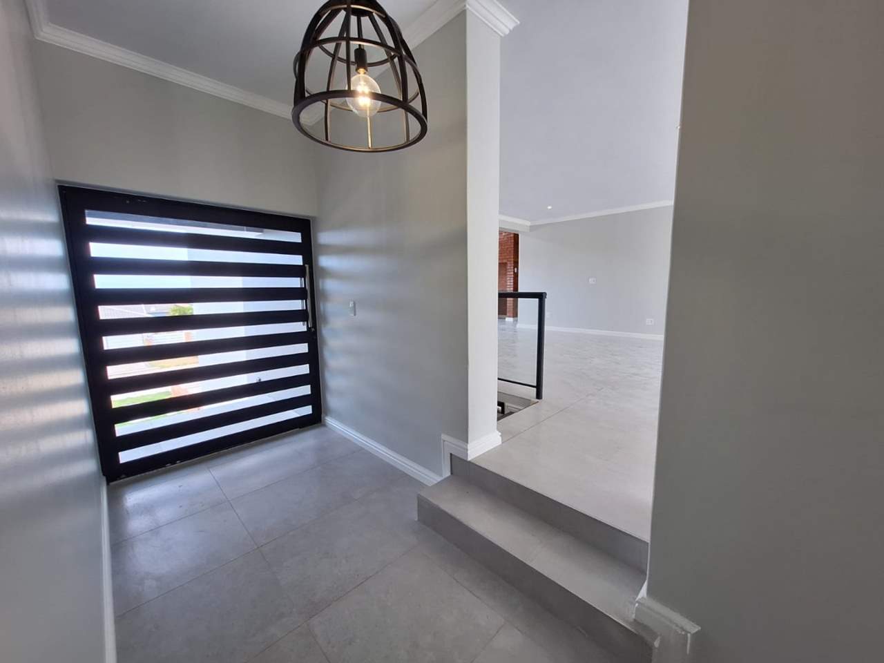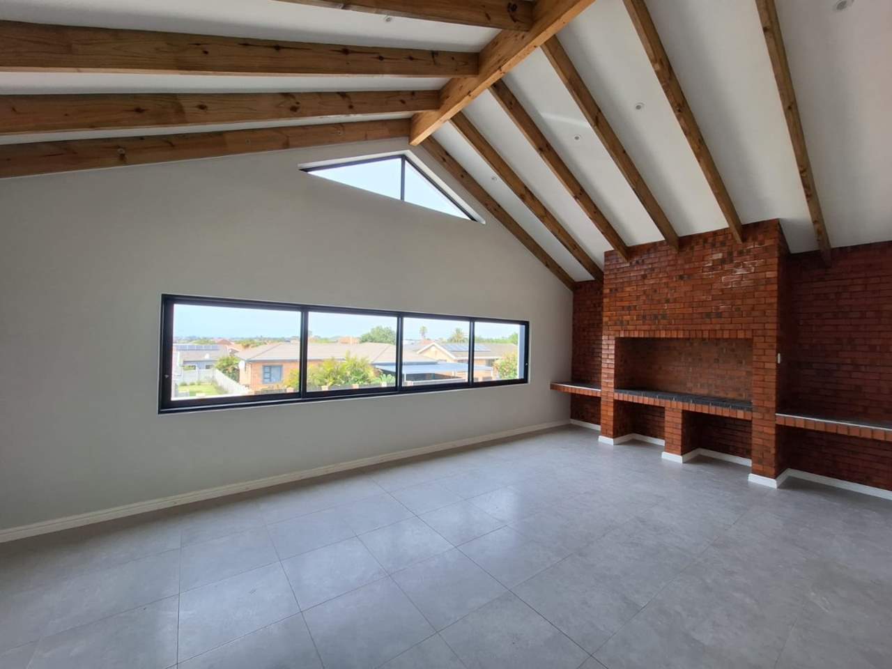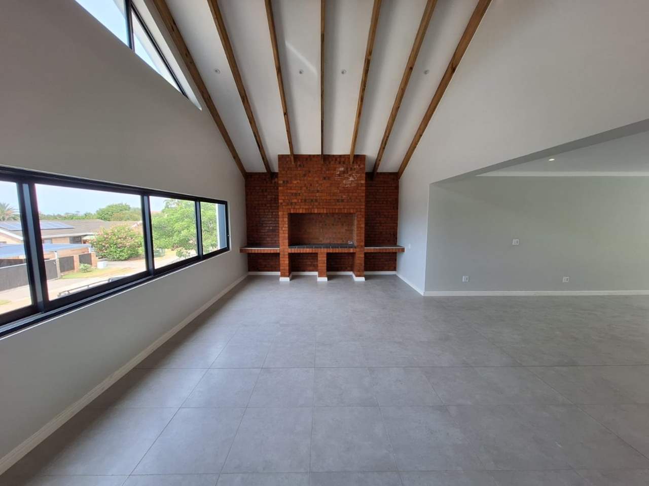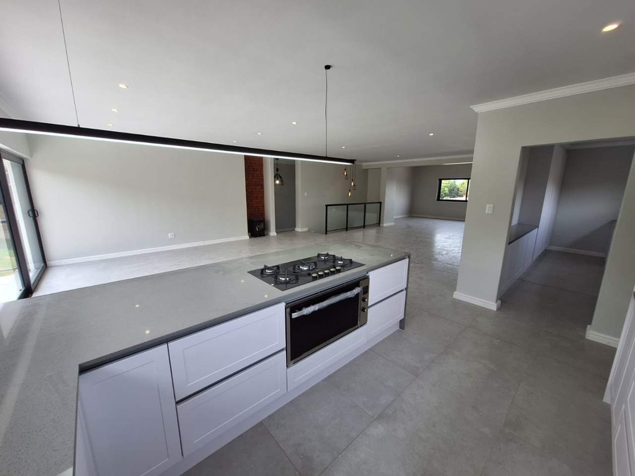 Wide stairs lead to a welcoming foyer, taking you to the living space. The entertainment wing boasts an expansive open-plan layout with a gourmet kitchen, separate scullery, and large island flowing into the dining and lounge areas. The indoor braai room with sweeping views is ideal for year-round entertaining, while sliding doors connect the dining space to a patio overlooking the private backyard.