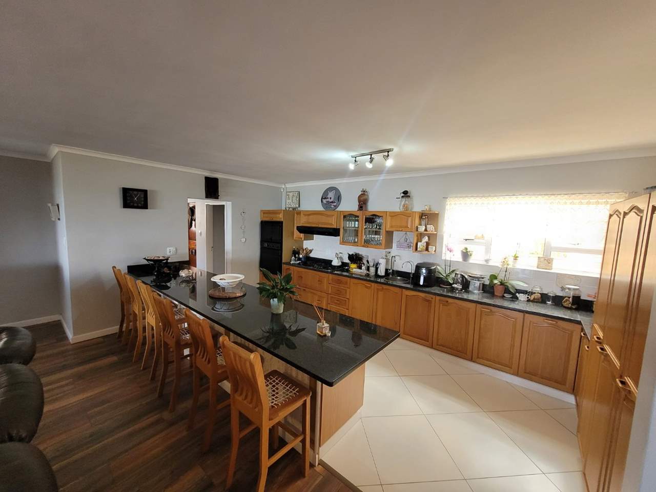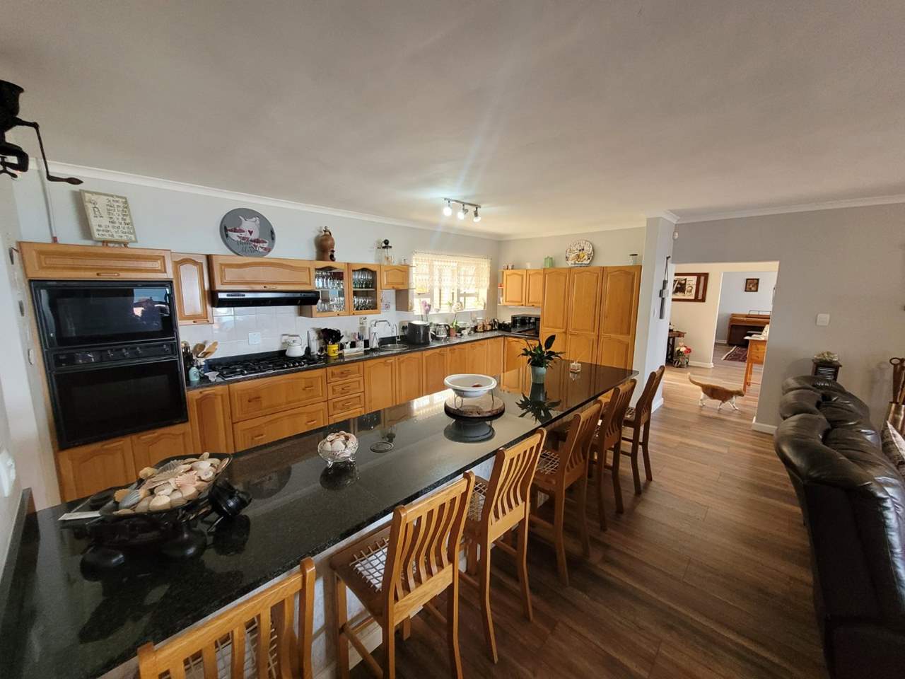 Modern, open-plan kitchen featuring granite counter tops, ample cupboard space, generous work surfaces, and a large separate scullery/laundry