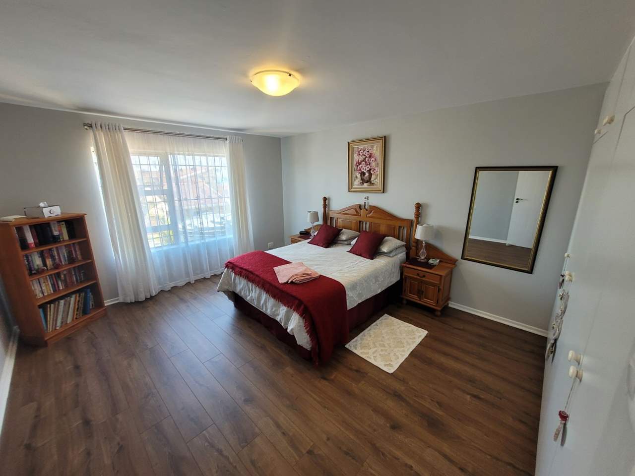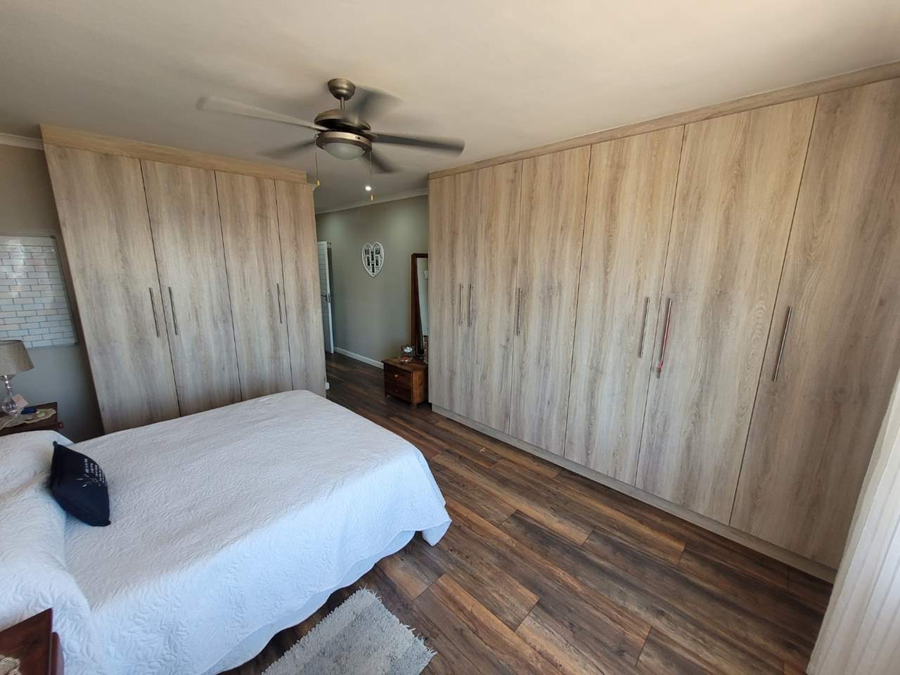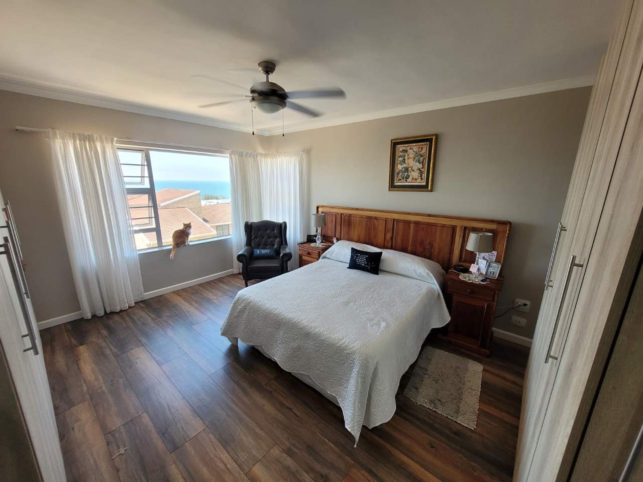 Large main bedroom with sea views, ample built-in cupboards, and a en-suite bathroom