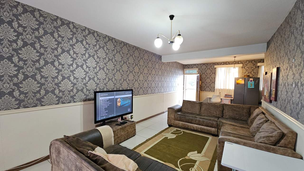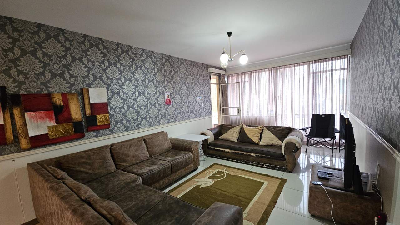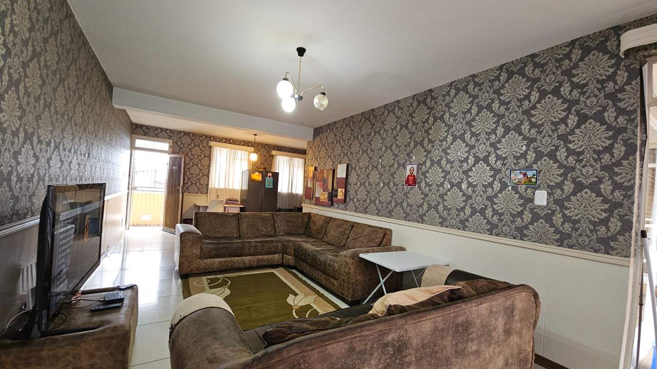 The expansive open-plan lounge and dining area creates a warm and inviting atmosphere, enhanced by striking feature wallpaper that adds character and charm. The main bedroom is generously sized with ample built-in cupboards, while the second bedroom is well-proportioned and versatile, perfect for guests, a child’s room, or a home office.