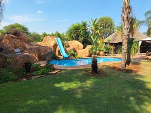 Outdoor living reaches new heights with a sparkling swimming pool that invites you to relax and unwind, while a grand thatch roof Lapa with a built-in braai sets the stage for unforgettable gatherings and delightful moments shared with loved ones. An outside Wendy house serves as a convenient laundry area, adding to the practicality and functionality of the property.